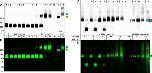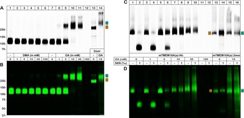 Fig. 4. Analysis of the oligomeric structure of mTMEM16A(a) following chemical cross-linking. mTMEM16A(a)-expressing X. laevis oocytes were metabolically labeled with [35S]-methionine overnight. After an additional 24-h chase, the outer oocyte surface was labeled with Cy5-NHS-ester. Immediately thereafter, the oocytes were homogenized in the presence of the indicated concentration of dimethyl adipimidate (DMA) or glutaraldehyde (GA). The proteins were purified by nondenaturing Ni-NTA chromatography and resolved in the fully SDS-denatured state with reducing SDS-urea-PAGE (A, B) and in the nondenatured and partially SDS-denatured state with BN-PAGE (C, D). The upper and lower panels present the [35S]-methionine-labeled total form and the Cy5-labeled plasma membrane-bound form of the polypeptides. Note that no protein could be isolated following treatment with 100 mm glutaraldehyde. The concatenated mTMEM16A(a) dimer was also analyzed. The orange and green double ovals indicate the position(s) of the concatenated mTMEM16A(a) homodimer following no treatment or treatment with 10 mm glutaraldehyde, respectively. Lanes 12â14 were taken at threefold higher image gain settings than the other lanes.