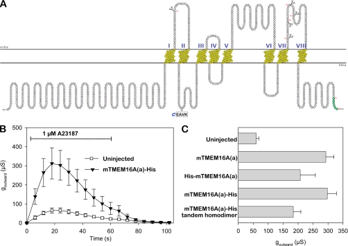 Fig. 1. Functional characterization of mTMEM16A(a) in X. laevis oocytes. A, Topological model of mTMEM16A, as drawn with TeXtopo (44). The indicated location of the transmembrane segments (TMI-TMVIII) was calculated with the topology prediction program MEMSAT3.0 (56). The C-terminal His tag (green) and the positions of the five luminally located N-glycosylation sequons (NXS/T) are also indicated. Human TMEM16A(a) isoforms are generated by the inclusion or omission of three alternative segments, b-d (14), of which the sequence of segment c (EAVK) was identified in the mouse genome following a BLAST search of DNA databases. B, Current responses were elicited in uninjected control oocytes and mTMEM16A(a)-expressing oocytes by the addition of 1 μm A23187 for the time indicated by the horizontal bar. The time-dependent outward conductances are the mean ± S.E. of recordings from five to six oocytes per data point. C, The bars represent the mean ± S.E. (5 to 17 oocytes per bar) of the maximum outward conductance from the A23187-elicited current response in oocytes expressing the indicated mTMEM16A(a) constructs, recorded as in B.