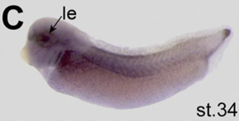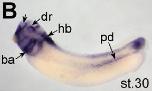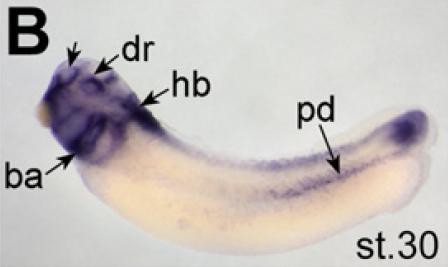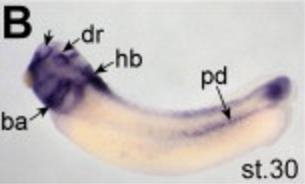 crabp2 () gene expression in X. during organogenesis. In situ hybridisation of crabp2, dark blue stain indicates expression. Stage 30.