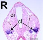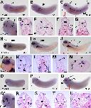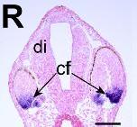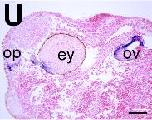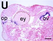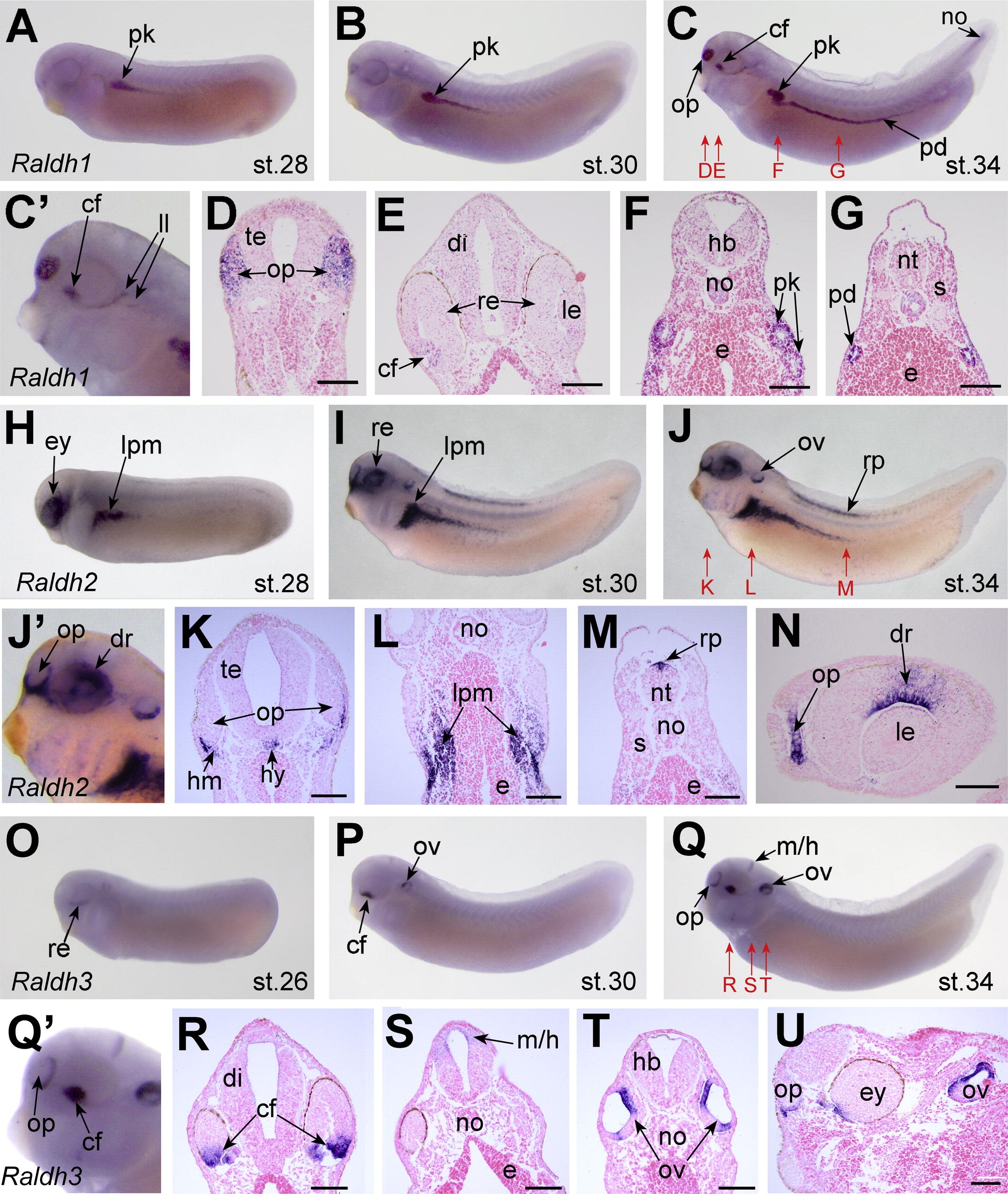Raldh3 expression in stage 34 embryo, red arrows indicate relative positions of transverse sections in panels RâT. (Qâ) Detail of head of embryo shown in panel Q. Abbreviations: di, diencephalon; cf, choroid fissure; dr, dorsal retina; e, endoderm; ey, eye; hb, hindbrain; hy, hypophysis; le, lens; ll, lateral line precursors; lpm, lateral plate mesoderm; m/h, midbrain hindbrain boundary; no, notochord; nt, neural tube; op, olfactory placode; ov, otic vesicle; pk, pronephritic kidney; pd, pronephritic duct; re, retina; rp, roof plate; s, somite; te, telencephalon. Scale bars are 100 μM.