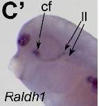 Expression of Raldh3 during organogenesis. In situ hybridization of Raldh3, dark blue stain indicates expression. Stage 34. di, diencephalon; cf, choroid fissure; dr, dorsal retina; e, endoderm; ey, eye; hb, hindbrain; hy, hypophysis; le, lens; ll, lateral line precursors; lpm, lateral plate mesoderm; m/h, midbrain hindbrain boundary; no, notochord; nt, neural tube; op, olfactory placode; ov, otic vesicle; pk, pronephritic kidney; pd, pronephritic duct; re, retina; rp, roof plate; s, somite; te, telencephalon. Scale bars are 100 μM.