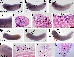 Fig. 2. Expression of Cyp26a and b during organogenesis. In situ hybridisation of Cyp26a and b, dark blue stain indicates expression. Panels AâF are Cyp26a and GâL are Cyp26b. Panels AâC and GâI are whole mount whole mount lateral views with head facing left and dorsal uppermost. (A) Expression of Cyp26a at stage 28. (B) Expression of Cyp26a at stage 30. (C) Expression of Cyp26a at stage 34. (Bâ) Close-up view of intersomitic staining in embryo shown in panel B. (DâF) 12 μm sagittal sections through previously stained stage 34 embryo showing Cyp26a expression in dark blue and with eosin (pink) used as a counterstain. Heads are to the left and dorsal uppermost. (D) Section through eye. (E) Deeper section (more towards midline) through head area. (F) Section through trunk somites. (G) Cyp26b expression in stage 28 embryo. (H) Cyp26b expression in stage 30 embryo. (I) Cyp26b expression in stage 34 embryo. Red arrows indicate the level of sections used in panels K and L. (Hâ) Closer detail of the rhombomere staining in panel H. (J) Sagittal section through stage 34 embryo showing expression in numbered rhombomeres of the hindbrain. Anterior is to the left and dorsal uppermost (J). (K) Transverse section at the level of the otic vesicles showing hindbrain staining localised towards the lumenal side. (L) Transverse section through ventral embryo at the level of the heart showing staining in ventral aortae. In K and L, dorsal is uppermost. All scale bars are100 μm. Abbreviations: ba, branchial arches; cf, choroid fissure; e, endoderm; he, heart; isv, intersomitic vessels; le, lens; lpm, lateral plate mesoderm; ov, otic vesicle; r, rhombomere; re, retina; s, somite; tb, tailbud; va, ventral aortae.
