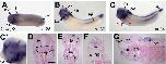 Fig. 3. Expression of Crabp2 during organogenesis. In situ hybridisation of Crabp2, dark blue stain indicates expression. (A) whole mount embryos with anterior to the left and dorsal uppermost. (A) Expression at stage 28. (B) Expression at stage 30. (C) Expression at stage 34. Red arrows indicate positions of transverse sections in panels D. (C Detail of head region of embryo pictured in panel C. (D) Transverse sections through stage 34 embryo. Scale bars are 100 lm. (D) Staining in head mesenchyme ventral to olfactory placodes, at the level of the telencephalon. (E) Staining in branchial arches and dorsal retina at eye level. (F) Staining in the hindbrain is strongest at the lumenal surfaces. (G) Sagittal section though stage 34 embryo showing staining in branchial arches, head mesenchyme, midbrain/hindbrain boundary region and posterior hindbrain. Scale bar is 100 lm. Abbreviations: ba, branchial arches; dr, dorsal retina; hb, hindbrain; hm, head mesenchyme; le, lens; m/h, midbrain hindbrain boundary; no, notochord; op, olfactory placode; ov, otic vesicle; pd, pronephritic duct; s, somite; tb, tailbud; te, telencephalon.