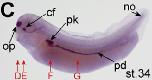 aldh1a1 (aldehyde dehydrogenase 1 family member A1 ) gene expression in Xenopus laevis embryos, NF stage 34, as assayed by in situ hybridization, lateral view, anterior left, dorsal up. (key: op= olfactory placode; cf= choroid fissure; pk= pronephric kidney; pd= pronephric duct; no= posterior notochord)