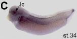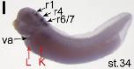 cyp26b1 ( cytochrome P450, family 26, subfamily B, polypeptide 1 ) gene expression in Xenopus laevis embryos, NF stage 34, as assayed by in situ hybridization, lateral view, anterior left, dorsal up.