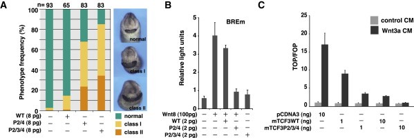 Figure 5. Wnt-Dependent TCF3 Phosphorylation Relieves Transcriptional Repression(A and B) Xenopus TCF3 phosphorylation mutants enhance the dorsoanterior fate (A) and inhibit Wnt8-dependent reporter activation of BREm-Luc (B). TCF3 RNAs were injected into four animal pole blastomeres at the eight-cell stage. Representative phenotype classes based on cement gland size at stage 28 are shown. Class I, more than double the size of a normal cement gland; class II, more than triple the size of a normal cement gland.(C) Mouse TCF3 P2/3/4 mutant inhibits Wnt-dependent reporter activation in HEK293 cells more efficiently than wild-type TCF3 (p < 0.05 for 1 ng and p < 0.01 for 10 ng, respectively). TOP/FOP is the ratio of STF reporter activity over STM reporter activity, presented as means ± SD. |