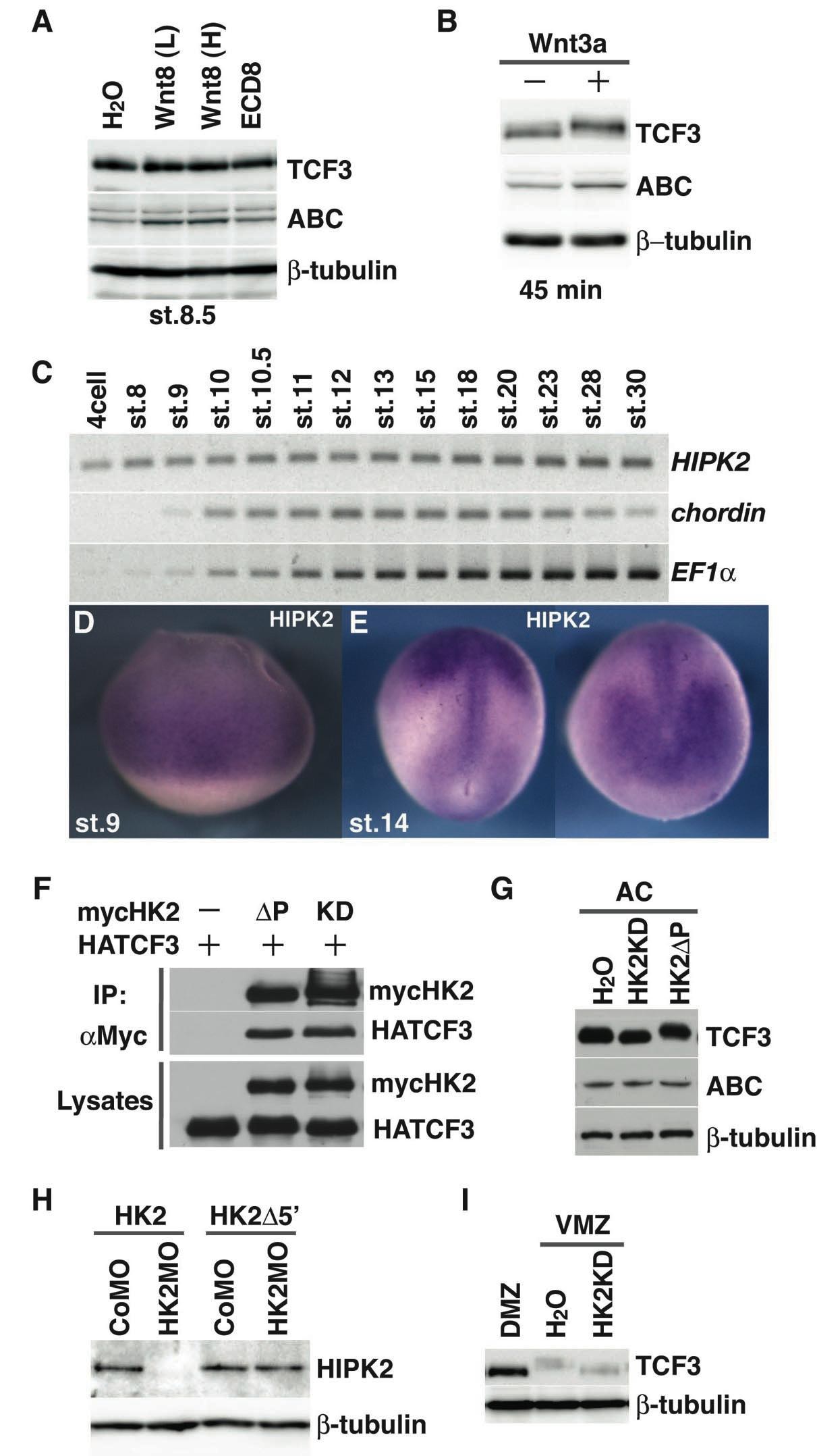 Figure S1. Wnt/HIPK2-dependent TCF3 phosphorylation (A) Wnt8 does not induce TCF3 phosphorylation before the midblastula stage. All blastomeres of 8-cell stage embryos were injected with Wn8 RNA (L: 40 pg, H: 200 pg) or ECD8 (2 ng). (B) Wnt3a-containing medium stimulates TCF3 phosphorylation in dissociated ectoderm cells (stage 10) within 45 min. (C-E) HIPK2 RNA during early development. (C) HIPK2 transcript levels have been assessed by RT-PCR at different developmental stages. Chordin is a zygotic gene, EF1a, a maternal and zygotic gene, is upregulated at late blastula stages. (D and E) Spatial distribution of HIPK2 RNA studied by whole mount in situ hybridization. HIPK2 is expressed strongly in the marginal zone and the animal pole at the late blastula stage (st. 9). At stage 14, HIPK2 RNA is abundant in the notochord and the anterior neural plate (left: dorsal view; right: anterior view). (F-I) HIPK2 modulates TCF3 phosphorylation. (F) HIPK2 associates with TCF3. Four cell embryos were injected with mycHIPK2δPEST (δP), mycHIPK2KD (KD, kinase-dead), and HATCF3 RNAs (500 pg, 500 pg, and 80 pg, respectively) for the analysis at early gastrula stages. Anti-myc antibodies coprecipitate HATCF3 only in the presence of HIPK2 proteins. HK2δP is an active form of HIPK2 that lacks apoptosis-inducing activity (see Suppl. experimental procedures). (G) HIPK2 does not alter ï¢-catenin stability in animal cap (AC) cells. AC lysates (stage 12.5) from embryos injected with HK2KD or HK2âP RNA (400 pg each) were probed with anti-TCF3 (Zhang et al., 2003) and ABC (activated β-catenin) antibodies. (H) HIPK2MO (HK2MO, 20 ng) specifically inhibits the translation of HIPK2 RNA (HK2) in injected embryos, but has no effect on HK2â5NA lacking target sequence. (I) HK2KD (400 pg) blocks the phosphorylation of endogenous TCF3 in ventral marginal zone (VMZ) explants. Embryos were dissected as described in Figure 1C. |