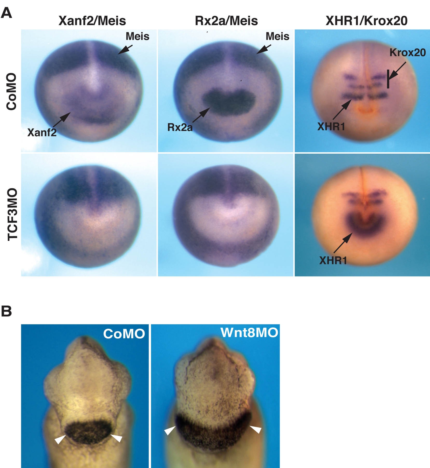 Figure S3. TCF3 is essential for anterior neural development. (A) TCF3MO blocks the anterior neural markers Xanf2 and Rx2a (95%, n=44, and 84%, n=45, respectively), but expands the midbrain-hindbrain boundary marker XHR1 (85%, n=41) and the posterior marker Meis3 (49%, n=89). Krox20 marks rhombomeres 3 and 5. TCF3MO (40 ng) was injected into animal blastomeres of 8 cell stage embryos. Injected embryos have been subjected to in situ hybridization analysis at stage 18. (B) Wnt8 depletion enhances anterior head development. Wnt8 MO (5 ng) was injected four times into the marginal zone of four-cell embryos. Anterior views are shown, dorsal is up. The panel for CoMO-injected embryo is the same image as shown in Fig. 3A. |