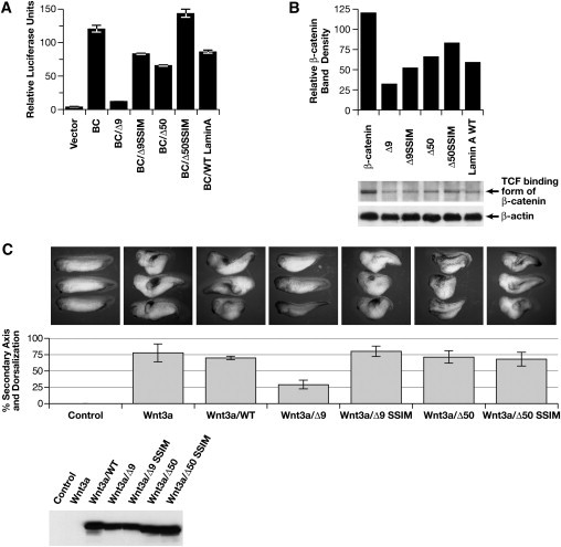 Figure 5. δ9 and δ50 Lamin Inhibit Wnt-Mediated Transcription(A) TOPflash/FOPflash luciferase reporter assays with WT (BC), δ9, δ50 lamins, or their SSIM variants.(B) Gst-Tcf pull-down of nuclear β-catenin levels.(C) Injection of Xwnt3a mRNA into Xenopus embryos, alone or in the presence of each LMNA construct shown in (A) and (B). Lower panel, western analysis shows amount of protein derived from the different LMNA mRNAs injected.Error bars are SEM. |