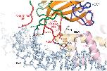 Figure 5. Model for Ran-RCC1-nucleosome core particle complex assuming no conformational changes. Ran (light blue) was modeled by aligning the RCC1 component of the Ran-RCC1 complex crystal structure (PDB id 1I2M) with one of the RCC1 subunits in the RCC1-nucleosome core particle structure. The flexible C-terminus of Ran is shown in white. The GDP nucleotide (magenta) was modeled using the nucleotide present in the RanGDP structure (PDB id 3GJ0). If Ran interacts with histones in the Ran-RCC1-nucleosome complex, a conformational change in either RCC1 or Ran presumably must occur.