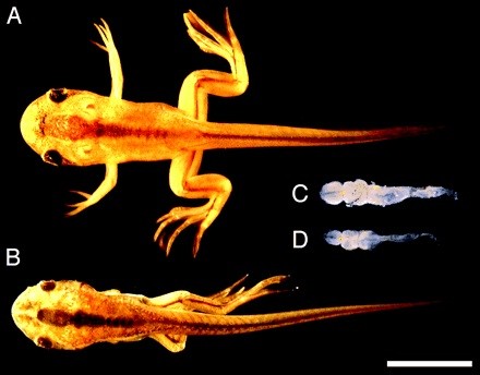 Transgenes that inhibit TH action in the nervous system produce quadriplegic tadpoles at the climax of metamorphosis. NF stage 62 control (A) and NβT:GFP-TRDN-transgenic (B) animals. Dissected brain and spinal cord of NF stage 60 control (C) and NβT:GFP-TRDN-transgenic (D) animals. (Scale bar for A, 1 cm.)