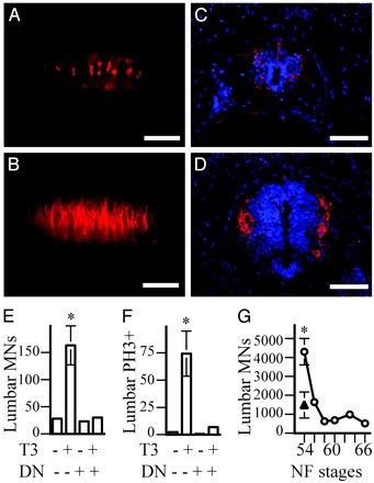 TH controls the early proliferation and production of limb motorneurons. (A) Lumbar spinal cords of 3-week-old control tadpoles. (A and B) Lateral view of whole mounts. (C and D) Transverse sections. (A and C) Controls. (B and D) Animals treated with 10 nM T3 during the third week. Limb motorneurons labeled with a RALDH-2 antibody are red and nuclei labeled by DAPI are blue. (Scale bars, 100 μmin A and B; 25 μmin C and D.) (E) The number of lumbar motorneurons (MNs), determined by counting RALDH-2-positive cells in whole-mount spinal cords. (F) The number of proliferating cells in the lumbar spinal cord, determined by counting PH3-positive cells in whole-mount spinal cords. The labeled groups (*) in E and F are significantly different from the other three groups (P < 0.001). (G) The number of lumbar motorneurons at various stages during metamorphosis in control animals (○), and at NF stage 54 in NβT:GFP-TRDN-transgenic animals (▴), determined by counting RALDH-2-positive cells in sections throughout the spinal cord. Values for control and NβT:GFP-TRDN-transgenic animals at stage 54 are significantly different (P = 0.005). Error bars in E represent the SEM.