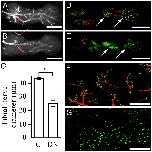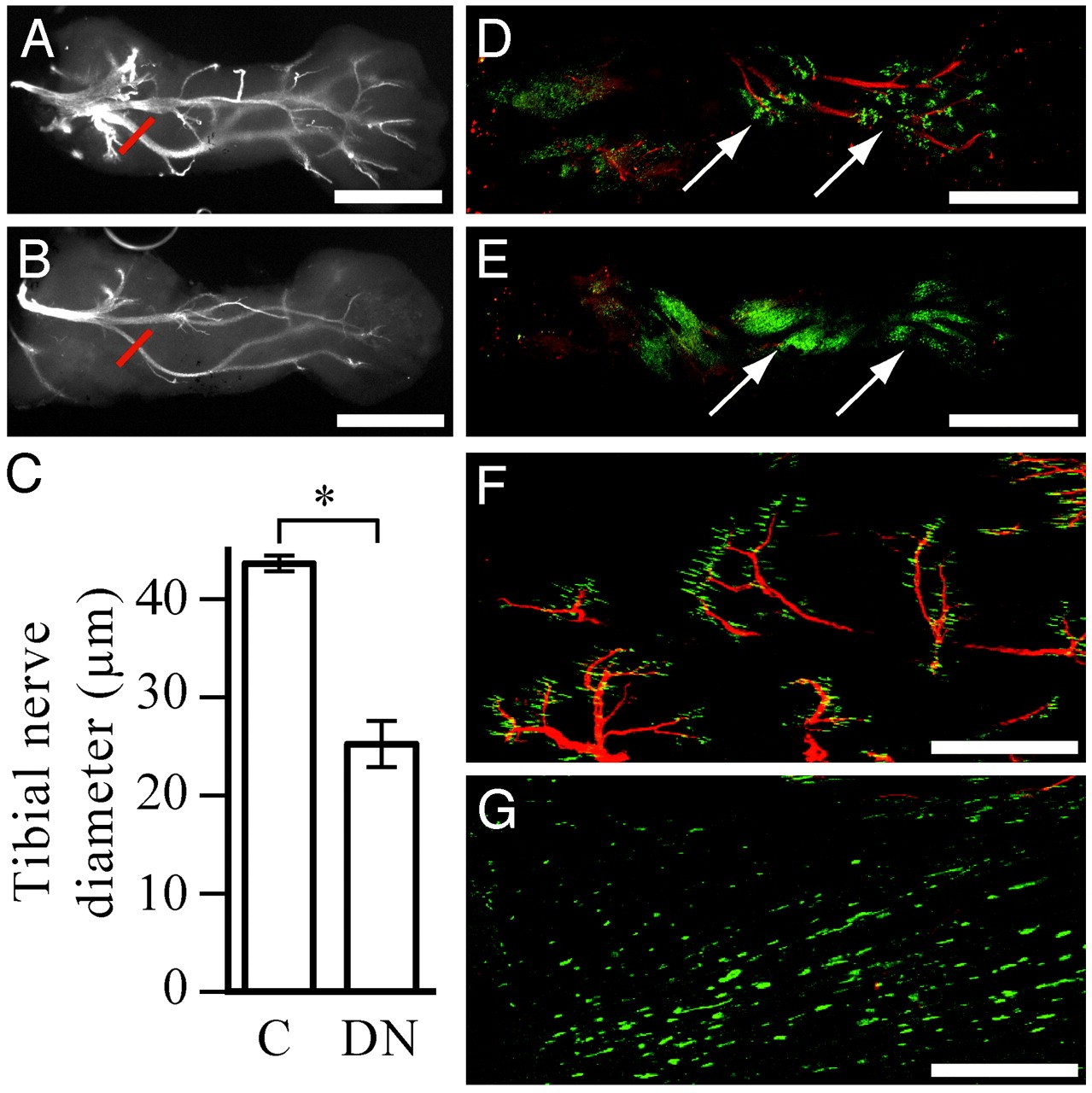 Transgenic animals develop defective neuromuscular junctions. Dorsal view of hindlimb nerves, labeled with 3A10 antibody, at NF stage 54 in control (A) and NβT:GFP-TRDN-transgenic (B) animals. (C) The diameter of tibial nerves, at positions marked in red in A and B, in control and NβT:GFP-TRDN animals at NF stage 54. Values are statistically different (*, P = 0.0014). Nerves and muscle synapses at NF stage 56 in control (D) and NβT:GFP-TRDN-transgenic (E) animals seen in a ventral view of the hindlimb. Arrows point to calf and foot muscles. Nerves and muscle synapses in the tibialis anteriormuscle at NF Stage 60 in control (F) and NβT:GFP-TRDN-transgenic (G) animals. In D, the nerves are labeled with 3A10 antibody (red), and the AChRs are labeled with α-bungarotoxin (green). (Scale bars, 500 μmin A and B and D and E; 250 μm in F.)