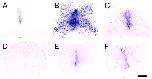 Fig. 2. Transgenes inhibit expression of TH-inducible genes in the spinal cord. In situ hybridization of cross-sections of the lumbar spinal cord at NF stage 62. TH/bZIP (A and D), gene 12 (B and E), xBTEB (C and F), control (A), and NβT:GFP-TRDN-transgenic (D) animals. (Scale bar, 200 μm.)