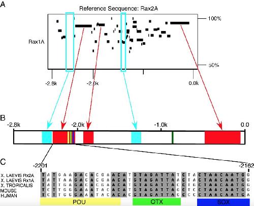 Fig. 2. Conservation and in silico analysis of the Rax2A regulatory region. (A) Percent identity plot (PIP) alignment of the Rax2A promoter with the Rax1A regulatory sequence (Zhang et al., 2003). Segments of DNA with percent identity above 50% are shown. Alignment analysis was performed using the PipMaker program (http://pipmaker.bx.psu.edu/pipmaker), which plots the percent identity of DNA segments between two or more designated sequences (Schwartz et al., 2000). (B) Schematic representation of the Rax2A regulatory region. Scale indicates transcription start to the right. Longest regions of highest identity revealed by PIP analysis (red boxes) and predicted cis-regulatory elements predicted by MatInspector are shown. Yellow: POU Domain Motif. Light Green: OTX Motif. Blue: SOX Motif. Dark green: Forkhead Motif. Regions of greatest divergence are shown in light blue. Arrows indicate relative locations of highly conserved regions or non-conserved regions between A and B. (C) Alignments showing conservation of predicted transcription factor binding sites within Ultra-Conserved Element 3 (UCE3). Completely conserved residues are shown in gray. Colored boxes indicate core transcription factor binding motifs. Numbers indicate relative position from proximal end of isolated Rax2A regulatory region.