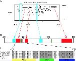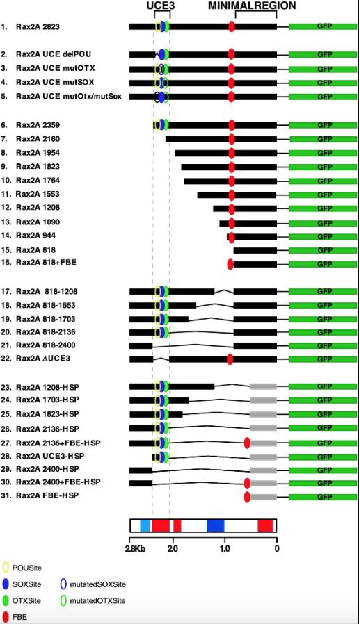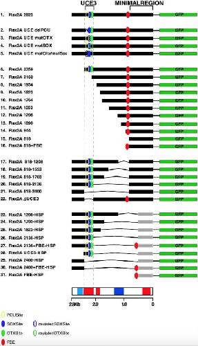 Fig. 3. Deletion constructs produced to investigate transcriptional activity of the Rax2A regulatory region. Deletion name and schematic representation of transgene constructs are shown: black bar, Rax2A sequence; green bar, GFP; gray bar, heat shock protein gene (HSP) promoter. The entire regulatory sequence isolated is shown in schematic form above and below the transgene constructs: red, regions of high conservation with Rax1A sequence, light blue, regions of divergence with Rax1A sequence; blue, predicted inversion event. Vertical dashed lines delineate the edges of UCE3 (ultra-conserved element 3.)