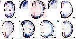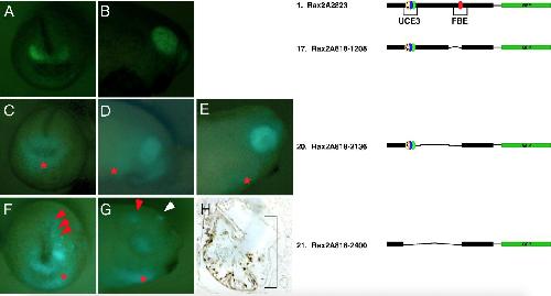 Fig. 5. Internal deletions of the Rax2A promoter demonstrate additional regulatory regions that provide spatial specificity. Fluorescent images of tadpoles generated using Rax2A/GFP internal deletion transgenes, as indicated on the right side of the figure. (AâB) Rax2A 818â1208; (CâE) Rax2A 818â1236; (FâH) Rax2A 818â2400. Embryos are shown at late neural plate/early neural tube stages (~ st 19/20; A, C, F) or tailbud stages (~ st 26â28; B, D, E, G). Embryo orientation: (A, C, F) anterior views; (B, D, E, G) lateral views. (H) Immuno-labeling of Rax2A 818â2400 transgene expression (brown spots) in the tadpole (st 41) heart (bracket). White arrows â regions of endogenous expression; red arrows â ectopic brain expression; red asterisks â ectopic ventral expression.