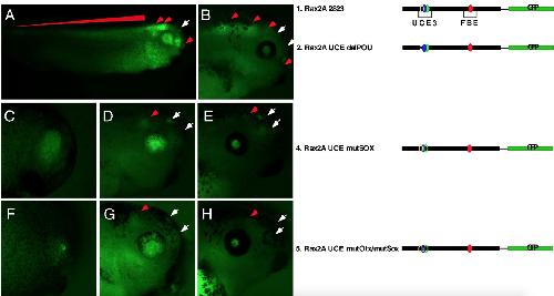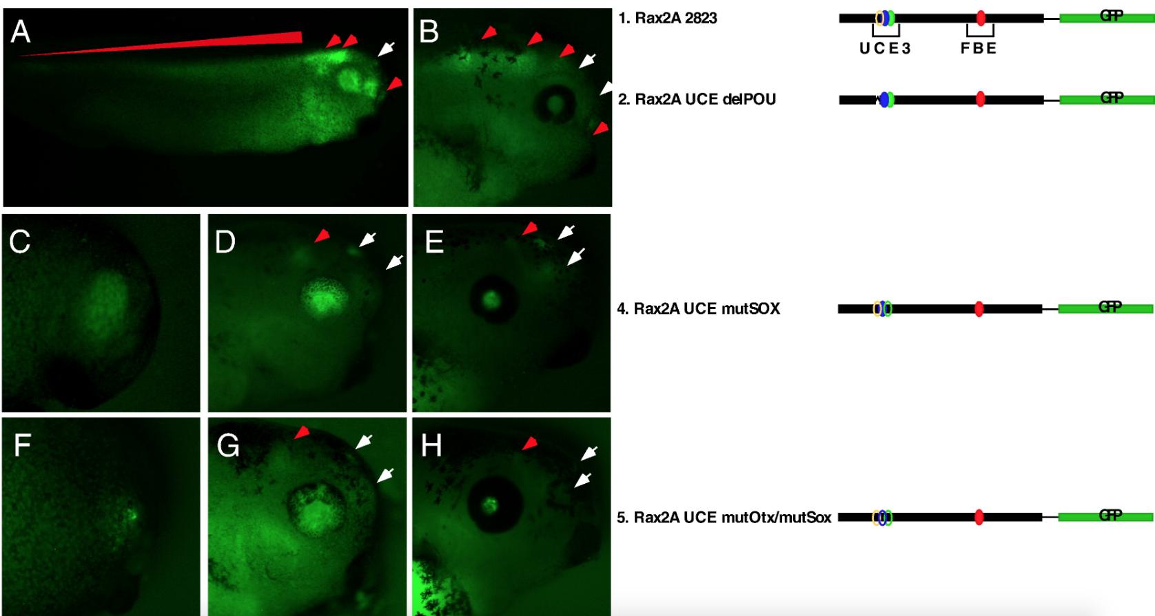 Fig. 7. POU, SOX and OTX sites within UCE3 cooperatively regulate Rax expression in the developing eyes of Xenopus laevis embryos. Fluorescent images of tadpoles generated using Rax2A/GFP with mutations in UCE3 conserved transcription factor binding sites. Transgenes represented are detailed on the right. (AâB) Rax2A UCE delPOU; (CâE) Rax2A mutOtx (â 2179/â1703); (FâH) Rax2A UCE mutSOX; (IâK) Rax2AUCE mutOtx/mutSox. Embryos are shown at tailbud (~ st 26â28; A, C, D, F, G) or tadpole (~ st 41; B, E, H) stages. All panels show lateral views. White arrows, regions of endogenous expression. Red arrows, ectopic expression.