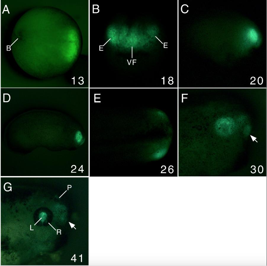 Fig. 1. Rax2A2.8 directs gene expression in the eye fields, ventral forebrain, and pineal gland. Fluorescent images of Rax2A2.8/GFP transgenic embryos and tadpoles. Stages are indicated in each panel. Views: (A, E) dorsal; (B) anterior; (C, D, F, G) lateral. Expression of GFP is first evident in the anterior neural plate (A), and is present in the developing eye during neural tube and tailbud stages (BâF). (E) Dorsal view demonstrating eye-specific expression. (G) At tadpole stages, GFP fluorescence is obstructed by the RPE but is readily observed through the clear lens. Abbreviations: B â blastopore, E â eye, VF â ventral forebrain, P â pineal gland, L â lens, R â RPE. Arrows indicate nonspecific nasal expression.