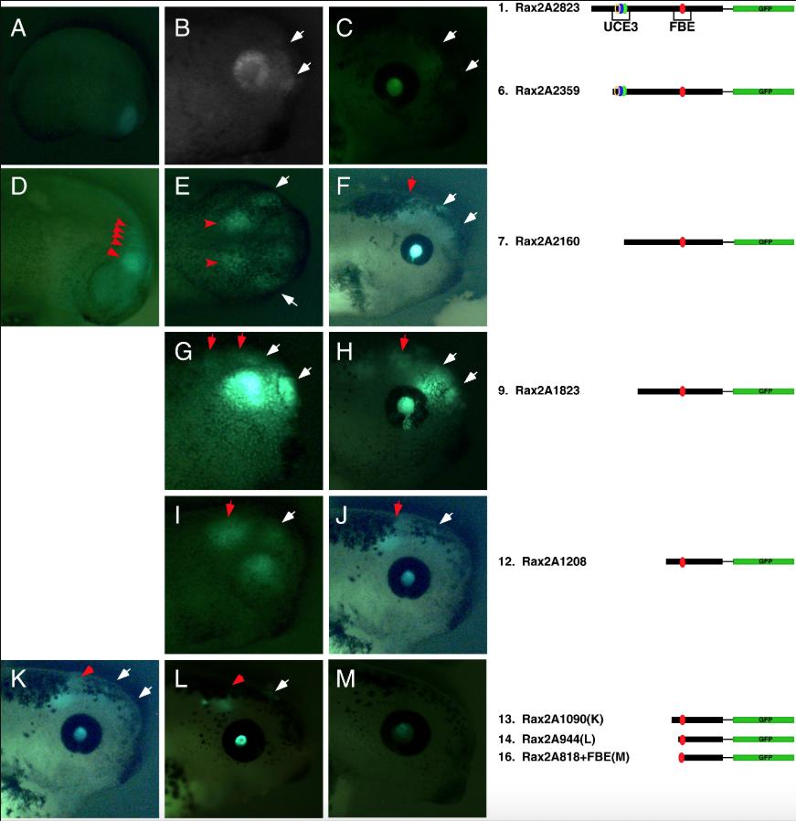 Fig. 4. The Rax2A promoter contains cis-elements required for proper spatial and temporal gene expression of the GFP transgene. Fluorescent images of tadpoles generated using Rax2A/GFP 5â²-deletion transgenes, as indicated on the right side of the figure. (AâC) Rax2A â 2394; (DâF) Rax2A â 2160; (GâH) Rax2A â 1823; (IâJ) Rax2A â 1208; (K) Rax2A â 1090; (L) Rax2A â 944; (M) Rax2A â 818 + FBE. Embryos are shown at early tailbud stages (~ st 24; A, D), mid-tailbud stages (~ st 28; B, E, G, I), or tadpole stages (~ st 41; C, F, H, JâM). All panels show lateral views except dorsal view in (E). White arrows â regions of endogenous expression; red arrows â ectopic expression.