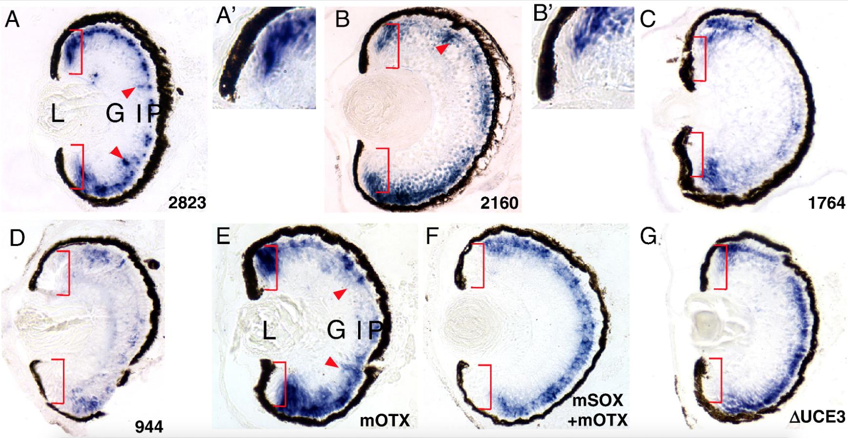 Fig. 8. Expression of Rax2A-GFP transgenes in the mature retina. Transgene expression was analyzed by in situ hybridization using a GFP riboprobe and sections of stage 41 transgenic tadpoles. (A, Aâ²) Rax2A 2823; (B, Bâ²) Rax2A 2160; (C) Rax2A 1764; (D) Rax2A 944; (E) Rax2A UCE3 mutOTX; (F) Rax2A UCE3 mutOtx/mutSox; (G) Rax2A ÎUCE3. Aâ² and Bâ² are high magnification views of A and B, respectively. Red brackets indicate the ciliary marginal zone (CMZ). Red arrowheads indicate examples of transgene expression in the inner nuclear layer. Abbreviations: L â lens; G â ganglion cell layer; I â inner nuclear layer; P â photoreceptor layer.