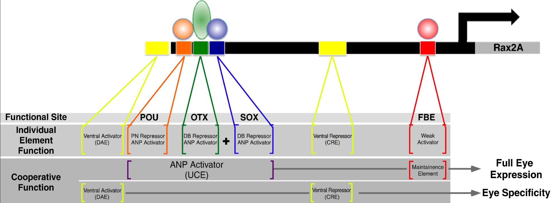 Fig. 9. Model of Rax2A transcriptional regulation derived from deletion analysis. Abbreviations: ANP â anterior neural plate; CRE â central repressor element; DAE â distal activator element; DB â dorsal brain; PN â pan-neural.