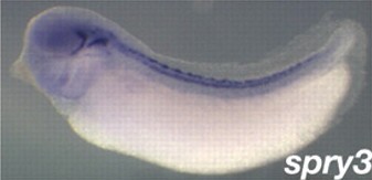 spry3 (sprouty homolog 3) gene expression in Xenopus laevis embryo, assayed via in situ hybridization, NF stage 40, lateral view, anterior left, dorsal up.