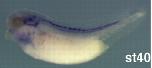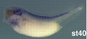 spry1 (sprouty homolog 1, antagonist of FGF signaling) gene expression in Xenopus laevis embryo, assayed via in situ hybridization, NF stage 32, lateral view, anterior left, dorsal up.