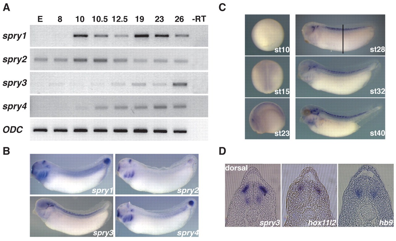 Fig. 2. Temporal and spatial expression pattern of spry3. (A) Total RNA was isolated from Xenopus of the indicated stages and RT-PCR performed using oligonucleotides specific for the indicated genes. E, embryo; âRT, stage 26 without reverse transcriptase. odc is a loading control. (B) Comparison of the pattern of expression of spry1, spry2, spry3 and spry4 at stage 32. (C) Analysis of the spatial expression of spry3 during Xenopus development. Embryos at the indicated stages were fixed and subjected to whole-mount in situ hybridisation using a probe specific for spry3. (D) Sections (plane indicated in C) of embryos stained with the indicated probes, showing expression in differentiated motor and sensory neurons.