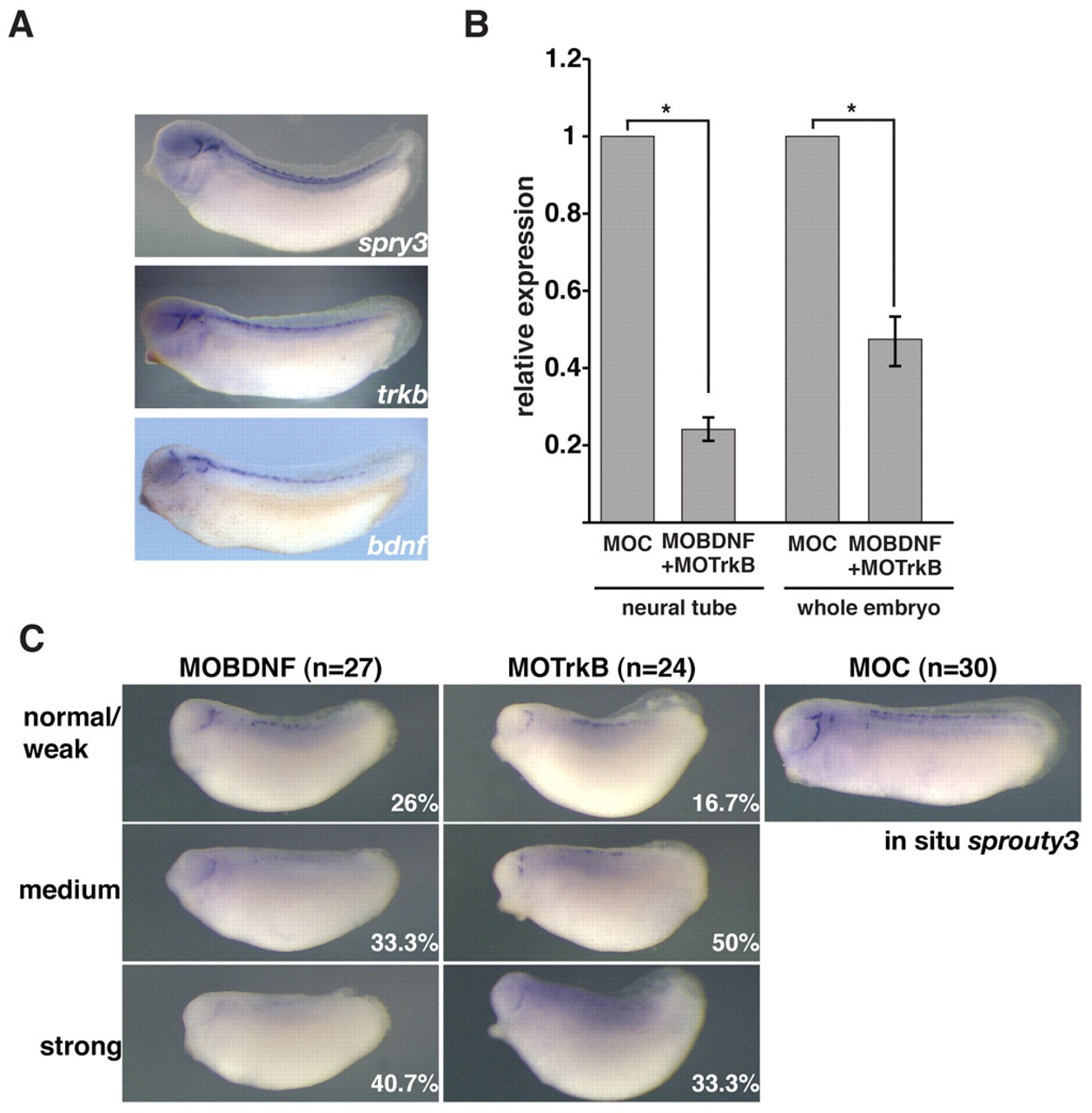 Fig. 4. spry3 expression is dependent on BDNF-TrkB. (A) Synexpression group of spry3. The pattern of expression of spry3 resembles that of bdnf and trkb. (B) Total RNA from whole embryos or isolated neural tube (stage 26) was purified from Xenopus embryos injected with morpholinos against bdnf (MO BDNF) or trkb (MO TrkB) or with a control morpholino (MOC). spry3 expression was assessed by real-time PCR using rpl8 as a reference. Knocking down bdnf and trkb results in a significant decrease in spry3 expression (*P<0.005, using a statistical ANOVA test). Error bars indicate mean ± s.e.m. (C) Xenopus embryos were injected at the 1-cell stage with MO BDNF, MO TrkB or MOC, fixed at stage 28 and processed for whole-mount in situ hybridisation using a probe specific for spry3. Embryos are scored as normal/weak when spry3 expression is detected both in the trigeminal nerve and the spinal cord, as medium when spry3 expression is only partially detected in the spinal cord and as strong when no expression of spry3 is detected. The percentage of affected embryos is indicated in each case.