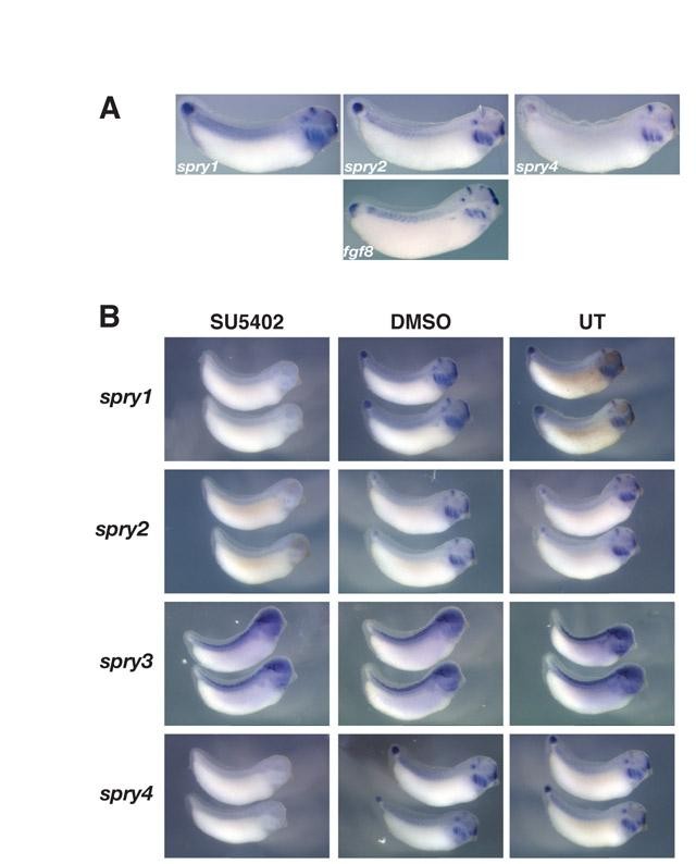 Fig. S2. FGF signalling is not necessary for spry3 expression. (A) Comparison of the pattern of expression of spry1, spry2 and spry4 with that of fgf8. (B) Xenopus embryos at stage 28 were treated with an FGFR inhibitor (SU5402), with DMSO or left untreated (UT) for 4 hours, then fixed and subjected to whole-mount in situ hybridisation with the indicated probes. The results presented are representative of two independent experiments.