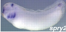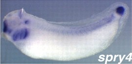 spry2 (sprouty homolog 2) gene expression in Xenopus laevis embryo, assayed via in situ hybridization, NF stage 32, lateral view, anterior left, dorsal up.