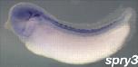 spry3 (sprouty homolog 3) gene expression in Xenopus laevis embryo, assayed via in situ hybridization, NF stage 23, lateral view, anterior left, dorsal up.