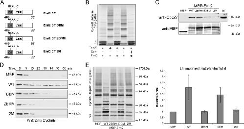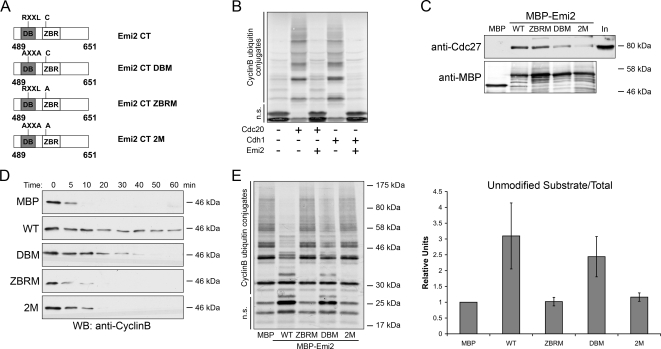 Figure 1. Characterization of DB and ZBR regions within the Emi2 C-terminus. (A) Emi2 C terminal (CT) mutants. DBM, D-box mutant; ZBRM, zinc-binding region mutant; 2M, double mutant. All relevant experiments in this article were performed with Emi2 CT. (B) In vitro APC/C assay was performed in the presence or absence of 600 nM GST-Emi2 with either Cdc20 or Cdh1 as the activator. Conversion of radiolabeled Cyclin B to ubiquitylated forms was monitored by autoradiography. n.s., nonmodified substrates. (C) recombinant MBP-Emi2, 50 nM (WT or mutants), was conjugated to amylose beads and incubated in Crude S extract for 20 min at 22°C. Beads were washed five times with PBS (supplemented with 300 mM NaCl and 0.1% Triton). The amount of associated Cdc27 was detected by Western blotting. In, Input. (D) recombinant MBP or MPB-Emi2, 50 nM (WT or mutants), was added into CSF extracts supplemented with Ca2+. Aliquots removed at the indicated times were analyzed by SDS-PAGE and immunoblotted for Cyclin B. (E) recombinant MBP or MPB-Emi2, 800 nM (WT or mutants), was added into in vitro APC/C assay with IVT Cdc20 as the activator. The immunoprecipitated APC/C was preincubated with Emi2 and Cdc20 together with E1, E2, and Ubiquitin for 1 h before substrates were added. Conversion of radiolabeled Cyclin B to ubiquitylated forms was monitored by autoradiography and phosphorimager. Four independent experiments were further quantified with ImageQuant5.0 (Molecular Dynamics, Sunnyvale, CA). n.s., nonmodified substrates.