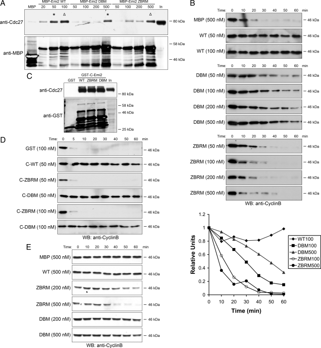 Figure 2. DB promotes binding of Emi2 to APC/C, whereas ZBR, is critical for its APC/C inhibitory activity. (A) Recombinant MBP or MBP-Emi2 (WT or mutant) at indicated concentrations was incubated in Crude S extract for 20 min at 22°C at the concentration as indicated and then pulled out with amylose beads. Samples were analyzed as in Figure 1C. Asterisks indicate that the amount of APC/C associated with 500 nM DBM was equal to that with 50 nM WT; triangles indicate that the amount of APC/C associated with 500 nM ZBRM was equal to that with 100 nM WT. In, Input. (B) Recombinant MBP or MBP-Emi2 (WT or mutant) at indicated concentrations were added into CSF extracts supplemented with Ca2+. Samples were analyzed as in Figure 1D; five samples as indicated were quantified with ImageQuant5.0. (C) recombinant GST-C-Emi2, 100 nM (WT or mutants), was conjugated to Glutathione beads and incubated in CSF extract supplemented with 50 nM MBP-Emi2 for 30 min at 22°C. Beads were washed five times with PBS (supplemented with 300 mM NaCl and 0.1% Triton). The amount of associated Cdc27 was detected by Western blotting. In, Input. (D) Recombinant GST or GST-C-Emi2, 50 nM or 100 nM (WT or mutants), was added into CSF extracts supplemented with Ca2+. Aliquots removed at the indicated times were analyzed by SDS-PAGE and immunoblotted for Cyclin B. (E) Recombinant MBP or MPB-Emi2 proteins (WT or mutants) at indicated concentrations were added into CSF extracts. Aliquots removed at the indicated times were analyzed by SDS-PAGE and immunoblotted for Cyclin B.