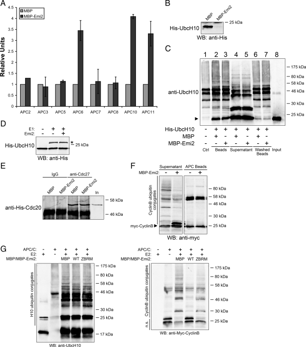 Figure 4. Emi2 inhibits APC/C by blocking the transfer of ubiquitin from activated E2 to substrates. (A) MBP or MBP-Emi2 conjugated to amylose beads were incubated with 35S-labeled IVT APC subunits for 1 h at 22°C. Beads were washed and bound IVT APC subunits were examined by SDS-PAGE and autoradiography. Results from at least three independent experiments for each subunit were quantified with ImageQuant5.0. (B) APC/C immunoprecipitated from mitotic extracts was preincubated with MBP or MBP-Emi2 (600 nM) for 15 min at 22°C. Purified His-UbcH10 was added to both samples and incubated for 1 h at 22°C. APC/C beads were washed and the bound UbcH10 was analyzed by Western blotting. (C) APC/C was immunoprecipitated from mitotic extracts and incubated with purified His-UbcH10 in the presence of MBP or MBP-Emi2 (600 nM) for 1 h at 22°C. E1, ubiquitin, and an energy regeneration system were also added to the reactions. Beads (washed or not with PBS supplemented with 300 mM NaCl and 0.1% Triton-100) and supernatant were separated and analyzed by SDS-PAGE and immunoblotted for UbcH10. Lane 1 was APC/C immunoprecipitant without UbcH10. The arrow indicates unmodified His-UbcH10. (D) His-UbcH10 was incubated with E1, ubiquitin and an energy regenerating system in the presence or absence of 600 nM Emi2 for 30 min at 22°C. Reactions were stopped with addition of sample buffer and charging of UbcH10 was analyzed by His immunoblotting. The asterisk indicates charged/activated E2. (E) APC/C immunoprecipitated from M phase extracts was incubated in XB buffer with recombinant His-Cdc20 in the presence of 500 nM MBP or MBP-Emi2 for 20 min at 22°C. APC/C beads were retrieved and washed. The amount of associated His-Cdc20 was detected by Western blotting. (F) APC/C immunoprecipitated from mitotic extracts were incubated with precharged UbcH10, Cyclin B, and an energy-regenerating system in the presence or absence of MBP-Emi2 (600 nM) for 1 h at 22°C. Sample buffer was added to supernatant and APC/C beads separately. The formation of ubiquitin conjugates on Cyclin B was analyzed by Myc Western blotting. (G) In vitro APC/C assay was performed in the presence of 500 nM MBP or MBP-Emi2 (WT or ZBRM) and the formation of ubiquitin conjugates on both UbcH10 and Cyclin B were analyzed by Western blotting for UbcH10 or Myc. n.s., nonmodified substrates.