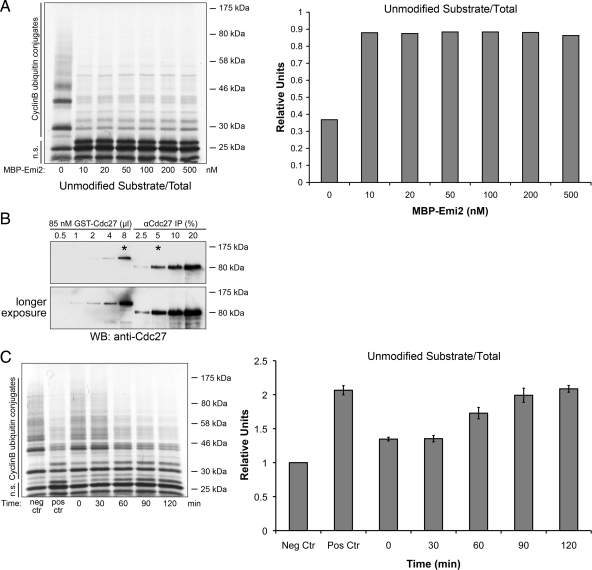Figure 5. Emi2 inhibits APC/C in a catalytic manner. (A) APC/C were immunoprecipitated from M phase extract and incubated with 1 μM recombinant His-Cdc20 and MBP-Emi2 at indicated concentrations for 45 min before substrate was added. Conversion of radiolabeled Cyclin B to ubiquitylated forms was monitored by autoradiography and phosphorimager. Results were further quantified with ImageQuant5.0. n.s., nonmodified substrates. (B) APC/C immunoprecipitated from same egg extract used in Figure 5A (Note that in experiments shown in Figure 5A, extract was driven into M phase as described in Materials and Methods) were quantified with recombinant GST-Cdc27 by Western blotting. Asterisks indicate that 5% of the amount of APC/C from one sample of the APC/C assay in A is equal to the amount of 8 μl recombinant GST-Cdc27 (85 nM). As the total volume of each sample in the APC/C assay was 40 μl, the concentration of APC/C in A was calculated to be 340 nM. (C) APC/C were immunoprecipitated from M phase extract and incubated with 1 μM recombinant His-Cdc20 and 5 nM MBP-Emi2 for indicated length of time before substrate was added. Conversion of radiolabeled Cyclin B to ubiquitylated forms was monitored by autoradiography and phosphorimager. Results were further quantified with ImageQuant5.0. Neg Ctr, 5 nM MBP was added instead of MBP-Emi2; Pos Ctr, 500 nM MBP-Emi2 was added; n.s., nonmodified substrates.
