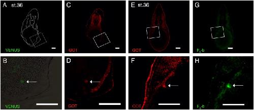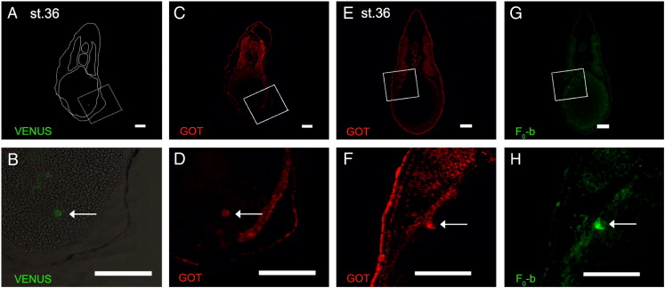 Fig. S1. Expression of F0-b in primordial germ cells (PGCs) of stage 36 embryos. (AâD) Sections of stage 36 embryos injected with venus-DEAD-South-3â²UTR mRNA. PGC was identified by VENUS protein translated from this mRNA. DEAD-South-3â²UTR had an anchoring signal to the germ plasm and enabled visualization of PGCs with VENUS protein (Kataoka et al., 2006). PGC was double-stained with antibodies against VENUS (green) and GOT (red). A VENUS-positive PGC (arrows in B, box A) was GOT-positive in endodermal cell masses that were very weak in GOT immunoreactivity (arrows in D, box C). (EâH) Sections of stage 36 embryos double-stained with antibodies against GOT (red) and F0-b (green). GOT-positive cell (arrow in F, box E) near the mesoderm in endodermal cell mass might be PGC, and it was also F0-b-positive (arrow in G, box H). Scale bars represent 100 μm.