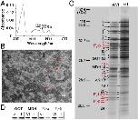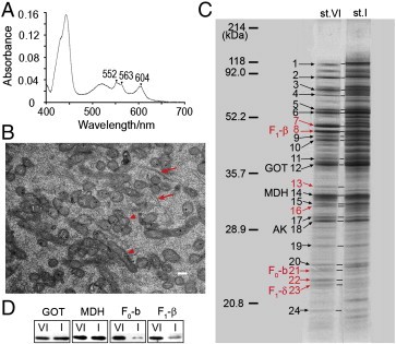 presented. Scale bar represents 200 nm (B). Protein profile in gradient SDS-PAGE (C). Red arrows show bands that indicated a lower protein level in stage I sample than stage VI sample. The 8, 21, and 23 bands were identified as F1-β, F0-b, and F1-δ, respectively. Black arrows show bands that were common to two samples. The 12, 14, and 18 bands