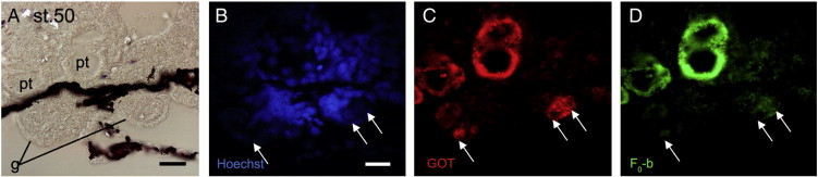 Fig. S2. Expression of F0-b in PGC of stage 50 tadpoles. (AâD) Frontal sections of stage 50 tadpoles labeled with Hoechst (blue), anti-GOT (red), and anti-F0-b (green). A pair of gonads (g) included PGCs, and pronephric tubules (pt) were situated on the peritoneum with heavy melanin (A). PGCs had a large nucleus poorly stained with Hoechst (arrows in B). PGCs localized in gonads were GOT- and F0-b-positive (arrows in C and D). Scale bars represent 20 μm.