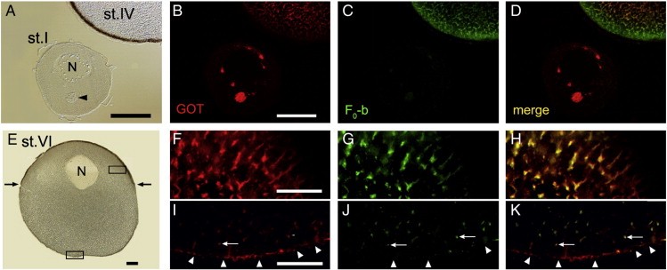 Fig. 2. Expression of F0-b in stage I and VI oocytes. Sections of ovary double-stained with antibodies against GOT (red) and F0-b (green). (AâD) A stage I oocyte in the center of (A) hasa mitochondrial cloud (arrowhead) under the nucleus (N). A stage IV oocyte is at the upper right. All mitochondria of the two cells were visualized by anti-GOT (B). All mitochondria in a stage I oocyte were F0-b-negative (C, D). Mitochondria in the animal hemisphere of stage IV oocyte were F0-b-positive. There was background fluorescence at the peripheralcytoplasm (C, D). (EâH) In a stage VI oocyte, arrows indicate boundary of animal hemisphere with heavy melanin granules and vegetal hemisphere (E). A stage VI oocyte has a largenumber of mitochondria labeled with anti-GOT in the animal hemisphere (F, upper box of E). Mitochondria were also labeled with anti-F0-b (G), overlaying GOT staining (H). (IâK)