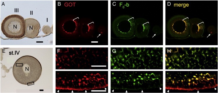 mitochondria in stage II and III oocytes were F0-b-positive (C, D). (EâH) A stage IV oocyte (E) has a large number of mitochondria marked with anti-GOT in the animal hemisphere (F,