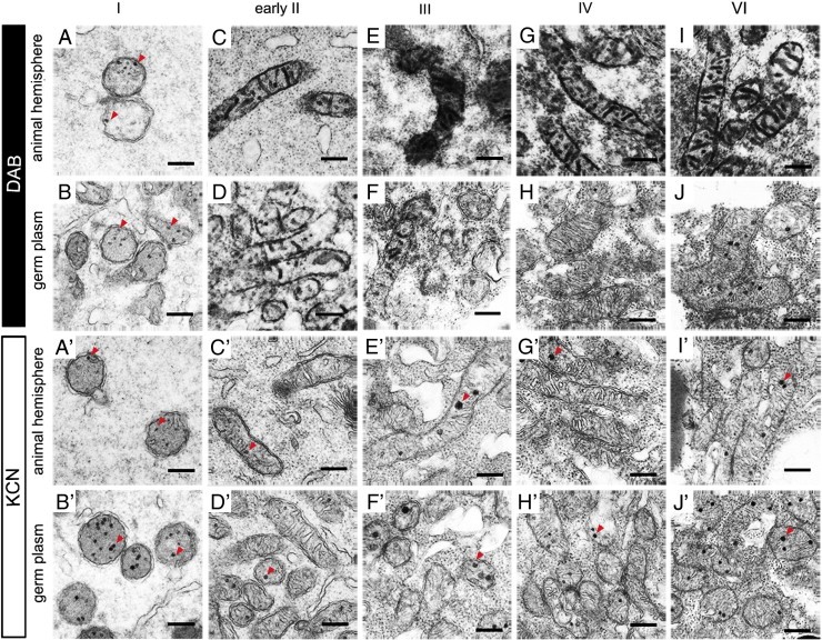 Fig. 4. Ultrastructural analysis of oocytes on COX activity during oogenesis. (A′–J′) KCN inhibits COX activity in all stages of oocytes. Dense granules (arrowheads) are mitochondrial