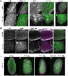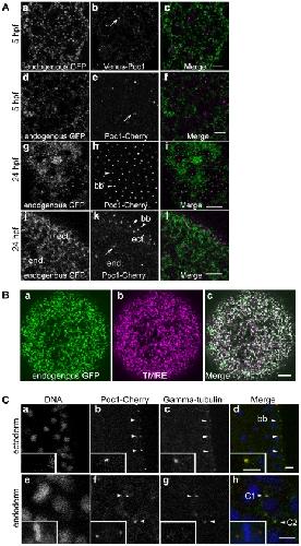 Figure 3. Clytia Poc1 is targeted to centrioles.Confocal images of embryos expressing fluorescent–tagged ChePoc1 protein following microinjection of mRNA constructs into the egg prior to fertilization. A. blastulae fixed at 5hpf (a–f) and planula larvae fixed at 24hpf (g,i: plane through apical ectoderm; j,k,l: plane through both endoderm (end) and ectoderm (ect)). Both fluorescent Poc1 proteins clearly localize to punctate aggregates positioned on the apical side of each ciliated ectoderm cell of the larva (bb/arrowheads: basal bodies), and randomly in blastula cells and larval endoderm (arrows). a,d,g,j: endogenous GFP showing the distribution of mitochondria in the cytoplasm of each cell (see B); b: Venus-Poc1; e,h,k: Poc1-mCherry; c,f,i,j: merged images. Scale bar: 10 µm. B. Confocal images of an unfertilized egg demonstrating that maternal endogenous Clytia GFP (a) is a natural mitochondrial marker, colocalizing with the mitochondrial dye TMRE (b) as seen in the merged image (c). C. Confocal images of larval cells expressing Poc1-mCherry following micro-injection of mRNA constructs into the egg prior to fertilization, fixed, and then processed for immunofluorescence with anti-gamma tubulin to locate centrosomes. Poc1-mCherry colocalizes with gamma-tubulin at the position of the basal body (bb/arrowheads- enlarged in insert) in ectoderm cells (a,b,c,d) and at the centrosomes of dividing cells in the endoderm (e,f,g,h) (C1/C2 = centrosomes close to prometaphase chromatin; metaphase cell in inset). a,e: DNA (Hoechst); b,f: Poc1-Cherry; c,g: gamma tubulin; d,h: merge (blue = DNA; red = Poc1-Cherry; green = gamma tubulin). Scale bars: 5 µm.