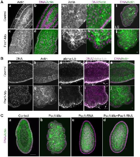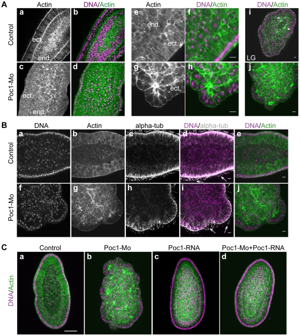 Figure 6. Poc1-MO disrupts gastrulation but not ciliogenesis.A. Confocal images of planula-stage embryos fixed one day after fertilization showing nuclear DNA labeled with Hoechst dye (purple in overlay) and actin with rhodamine-phalloidin (green in overlay). Poc1-MO at 2 mM (c,d) had little effect on the morphology of the ectoderm (ect), but cells in the endoderm were noticeably larger than in uninjected controls (a,b) and failed to organize into an epithelial layer. Following injection of Poc1-MO at 3 mM, the ectodermal layer was also found to be thickened compared to uninjected controls observed at the same time (e–f) and the cells organized in distinctive cell “rosettes” joined by strong basal actin bunches (g–h). The ectodermal organization in Poc1-MO embryos (h) closely resembled that of un-ingressed ectoderm cells (stars) in uninjected control embryos (g) at the late gastrula (LG) stage, consistent with the delay in gastrulation observed in time-lapse experiments. B. Confocal images of one-day planula–stage embryos stained with Hoechst dye (purple in overlay), rhodamine-phalloidin (green in overlay) and anti-alpha-tubulin to visualize microtubules including cilia (white in overlay, arrows). Pre-injection of 3 mM Poc1-MO (bottom row of images) caused severe disruption of morphology but did not prevent cilia growth on the ectodermal cells. C. Confocal images of one-day planula–stage embryos stained as in A, comparing uninjected embryos (a) with ones pre-injected with Poc1-MO (b), Poc1-mRNA alone (c) or Poc1-MO followed by Poc1-mRNA (d). The defects caused by Poc1-MO were abolished by subsequent mRNA injection, demonstrating specificity of phenotype. Poc1-mRNA alone had no major effect on cell or embryo morphology. Scale bar: 50 µm.