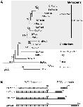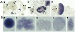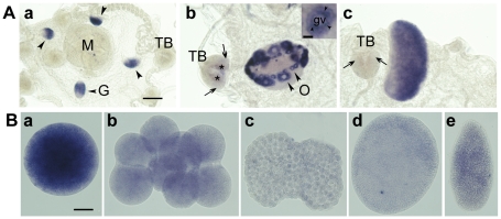 Figure 2. Expression of Clytia Poc1.A. Poc1 mRNA detected by in situ hybridization in adult Clytia medusae. a: Immature female. b: Mature female gonad showing high Poc1 mRNA concentrations in small and medium sized oocytes (inset shows an individual oocyte at higher magnification, with black arrowheads indicating the particulate distribution of the probe around the oocyte nucleus. Scale bar: 50 µm). c: Mature male gonad. Poc1 is expressed strongly in male and female gonads, and weakly at the base of the tentacle bulb (arrows in b and c). G = gonad; M = manubrium; TB = tentacle bulb; O = oocytes; gv = germinal vesicle. Asterisks in b indicate non-specific staining of the tentacle bulb endoderm, frequently observed in Clytia in situs [1]. Scale bar: 100 µm. B. Poc1 mRNA detected by in situ hybridization of eggs, embryos and larvae. Poc1 maternal mRNA is detected strongly in the unfertilized egg (a) but decreases progressively through cleavage (b: 8-cell stage) and blastula (c) stages. The relatively higher signal in gastrula (d) and planula (e) stages probably reflects new trancription starting from the blastula stage. Scale bar: 50 µm.
