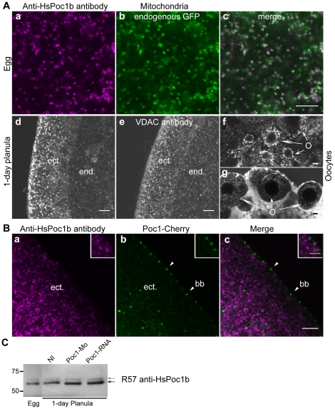 Figure 4. An Anti-Human Poc1 antibody recognizes mitochondria but not Clytia Poc1.A. HsPoc1 immunofluorescence (a,d,f) staining (mixed R56 and R57 antibodies) compared In spawned eggs (a–c), HsPoc1 co-localized with the mitochondria-targeted endogenous maternal GFP2 (b), while in larvae (d,e) it strongly resembled staining performed in parallel with rabit anti-VDAC antibody (e: ect. = ectoderm; end. = endoderm) and in oocytes (O) in live ovary pieces (f–g) with TMRE staining (g). Scale bars: 10 µm. B. HsPoc1 antibodies R56 and R57 (a) do not colocalize by immunofluorescence with Poc1-mCherry expressed protein (b) at ectodermal (ect) basal bodies (bb) in fixed planula larvae. In the merged images (c) the Poc1 antibody staining is shown in purple and Poc1-mCherry in green. Scale bar: 10 µm. Insets show enlarged basal bodies. Scale bar: 5 µm. C. Western blot probed with the Anti-HsPoc1b R57 antibody of groups of ten Clytia eggs or 1 with mitochondrial markers. 1-day planula larvae harvested after injection of 3 mM Poc1-MO and/or 1 µg/µl Poc1-RNA. Arrows indicate mayor and minor bands recognized by the antibody. The detected proteins are not depleted in the Poc1-MO extracts, nor enhanced in the ChePoc1 over-expressed extracts.