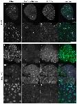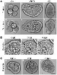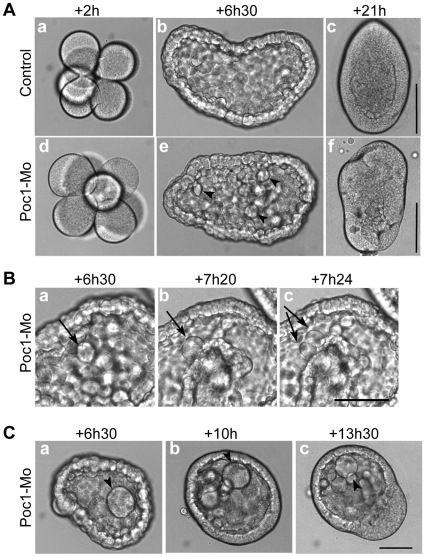 Figure 5. Poc1 MO disrupts cell division.Images from time-lapse recordings of Clytia embryos injected with Poc1-MO before fertilization (Movie S1). Times post fertilization are indicated. A. Cleavage divisions in Poc1-MO embryos proceeded in line with uninjected controls (a,d). Starting from around 6 hours post fertilization (blastula stage: b,e), Poc1-MO embryos showed lengthening of the cell cycle in some cells, followed by cell division defects/arrest, resulting in the appearance of larger cells (arrowheads). The accumulation of large cells in the blastocoel contributed to disruption and delay of gastrulation, resulting in characteristically deformed planula larvae (c,f). B. Cell cycle lengthening in a Poc1-MO blastula. Arrows identify a cell already larger than those around it cell which remains un-divided for at least 50 minutes (between a and b) before dividing (c). In uninjected controls filmed in parallel, cell division was largely synchronous until the blastula stage, with division occuring every 30 minutes (Movie S1, Figure 5A). C. Accumulation of abnormally large cells (arrowheads) in the blastocoel cavity (a), which remained undivided during gastrulation (b, c). Scale bars: 100 µm. Times indicated are hours post fertilization at 18°C.