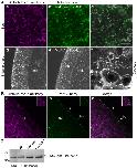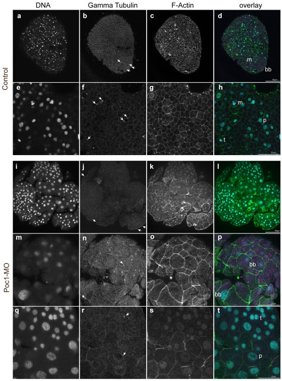 Figure 7. Centrosomes in Poc1-MO embryos.Confocal images of early gastrula-stage embryos stained with Hoechst dye for DNA (a, e, i, m, q), anti-gamma tubulin immunofluorescence (b, f, j, n, r) and Alexa-488-phalloidin for cortically-enriched F actin. In the overlays (d, h, l, p, t) DNA is blue, gamma tubulin purple and F-actin green. Control uninjected embryos (a–h) showed bright gamma tubulin dots (arrows) at the basal bodies of ectodermal cells (bb) and centrosomes of cells undergoing mitosis (prophase: p; metaphase: m; telophase: t). In embryos derived from Poc1-MO eggs (i–t), the size of the cells and the shape of many nuclei were irregular, indicating cell cycle disruption, however regular basal bodies (bb) remained clearly detectable in confocal sections through the apical ectoderm (m–p), and cells undergoing normal mitosis each with two gamma tubulin-rich centrosomes were detectable in deeper confocal planes (q–t).