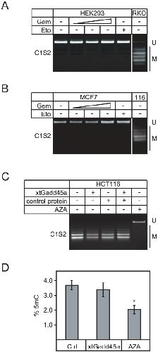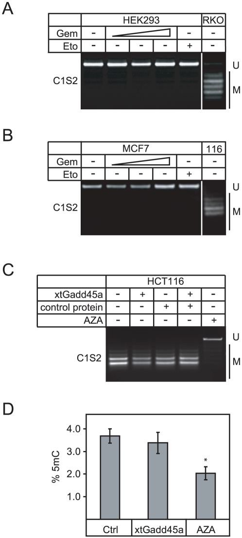 Figure 5. Gemcitabine does not affect global methylation levels.(A–B) Methylation of chromosome 1 satellite 2 (C1S2) in HEK293 (A) or MCF7 cells (B) was analyzed by combined bisulfite restriction analysis (COBRA). Note that neither gemcitabine (Gem, 33–134 nM) nor etoposide (Eto, 43 nM) treatment affect C1S2 methylation. C1S2 methylation of RKO cells (A, right) and HCT116 cells (116, B, right) serve as control for high C1S2 methylation. U, undigested (unmethylated) PCR amplicon; M, digested (methylated) restriction fragment. (C) COBRA analysis of C1S2 methylation in HCT116 cells as in (A, B). Cells were transfected with X. tropicalis Gadd45a (xtGadd45a) or treated with 5-aza-2′-deoxycytidine (AZA). U, undigested (unmethylated) PCR amplicon; M, digested (methylated) restriction fragment. (D) Capillary electrophoresis (CE) of DNA 5-methylcytosine (5mC). HCT116 cells were either treated with AZA or transiently transfected with X. tropicalis Gadd45a (xtGadd45a). After 48 h 5mC levels were determined by CE. Error bars represent standard deviation. Significance was assessed via Student's t-test using the untreated sample as reference: * = p<0.05.